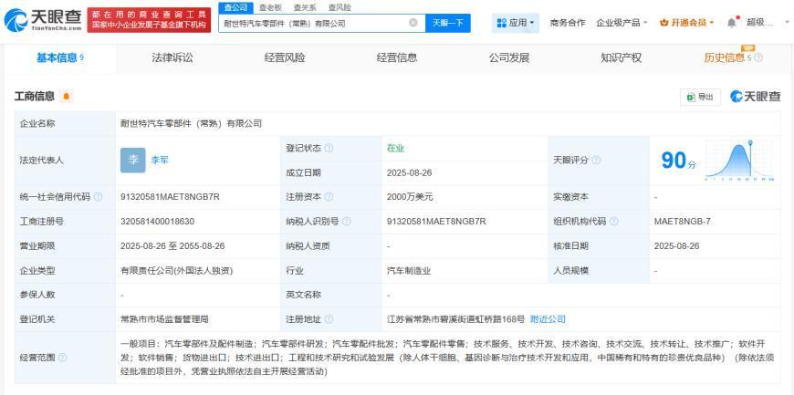 天眼查显示,近日,耐世特汽车零部件(常熟)有限公司成立,法定代表人为李军配资股中心官网,注册资本2000万美元,经营范围包括汽车零部件及配件制造、汽车零部件研发、汽车零配件批发等。股东信息显示,该公司由耐世特(中国)投资有限公司全资持股。