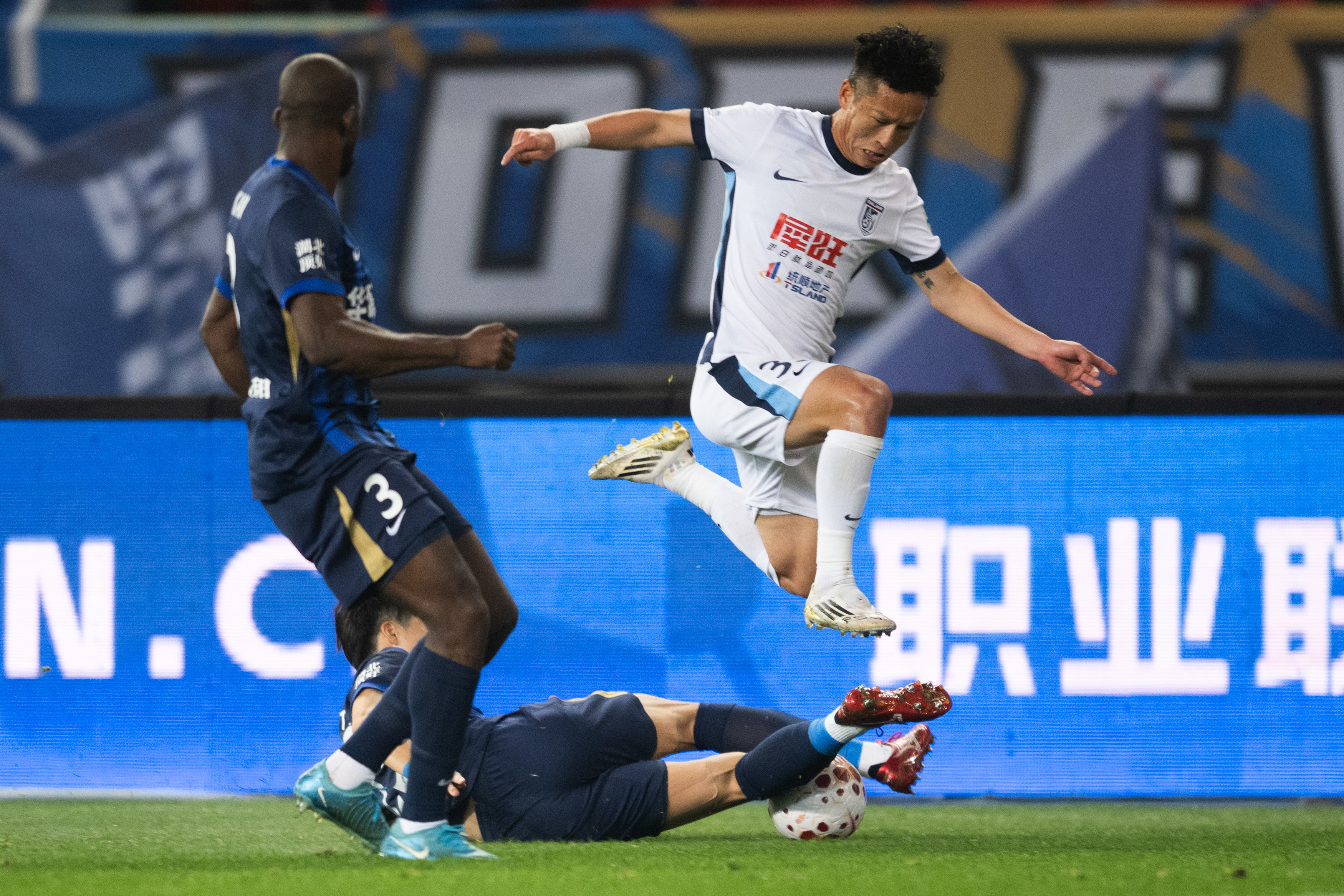 3月13日,武汉三镇队球员明天(左下)在比赛中防守大连英博队球员曹海清(右)的进攻。