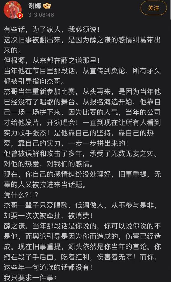 只是老实人有涵养不代表身边的人愿意容忍,至少耿直的谢娜不愿意看到家人被一次次拉出来溜,于是李雨桐再次喊话薛之谦的时候,谢娜发文并直言:公道自在人心。
